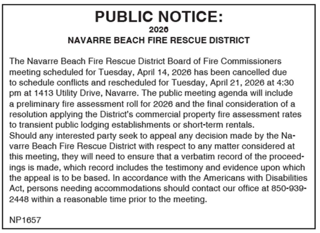 and will be held at 1413 Utility Drive, Navarre, FL 32566